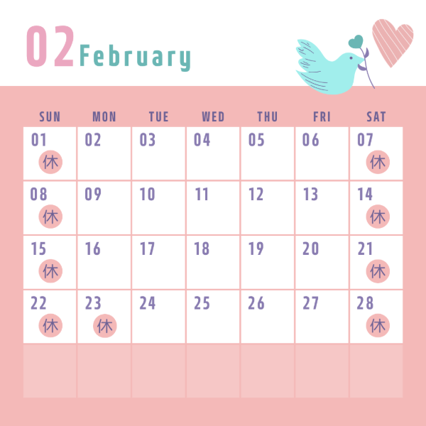 TOP > 新着情報 > 2月のカレンダー 新着記事 2月のカレンダー 2026.02.13(金) 2月の営業カレンダーです。 丸の日はお休みをいただきます。 メールでのお問い合わせは365日24時間受付しておりますので どうぞお気軽にご連絡ください✨ 前後の記事へのリンク NEWS LIST